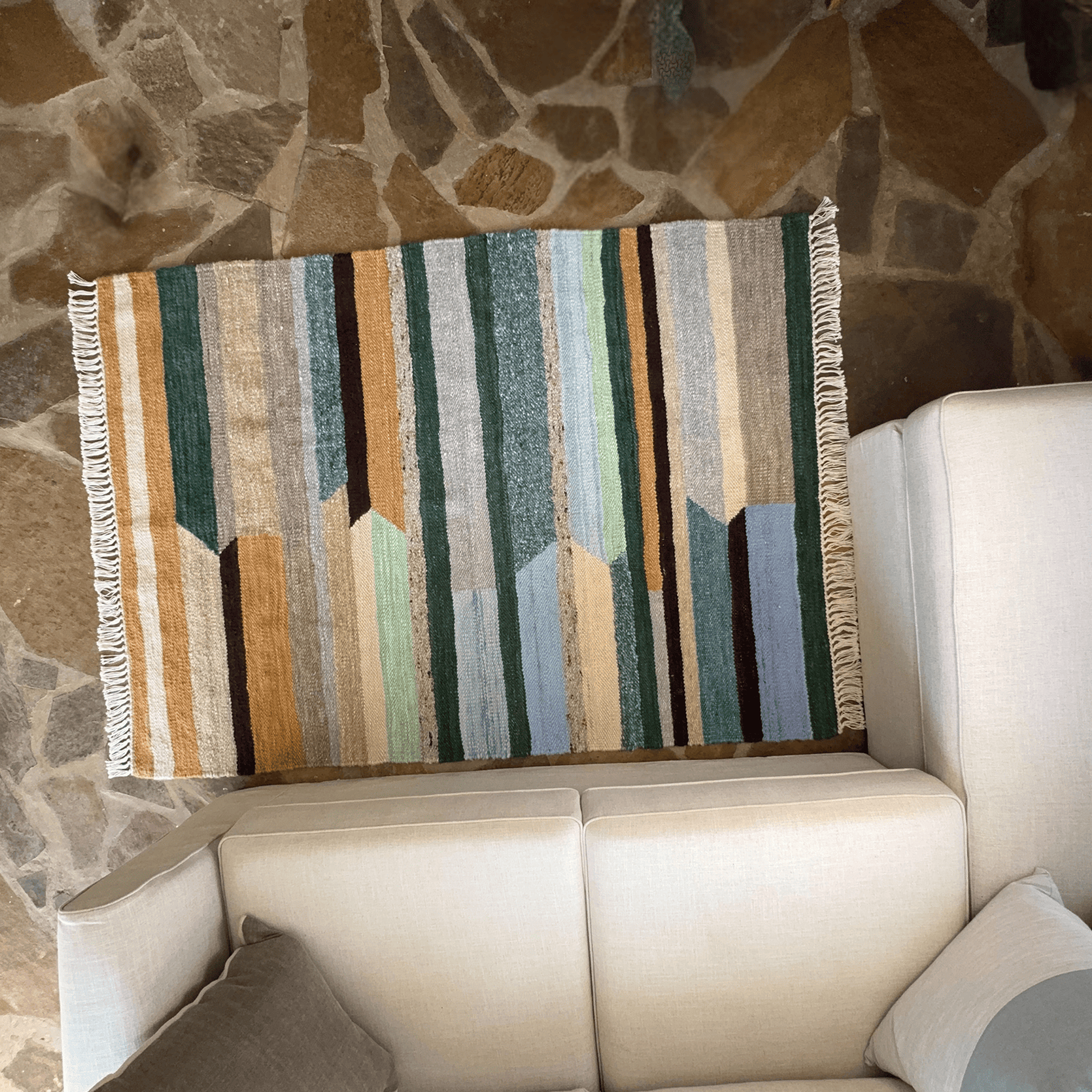 Using traditional weaving techniques passed down through generations, each carpet is built with a tight, dense weave to ensure long-lasting quality. The freeform horizontal pattern—featuring layered, collage-like bands—brings an organic, artistic touch to modern interiors.