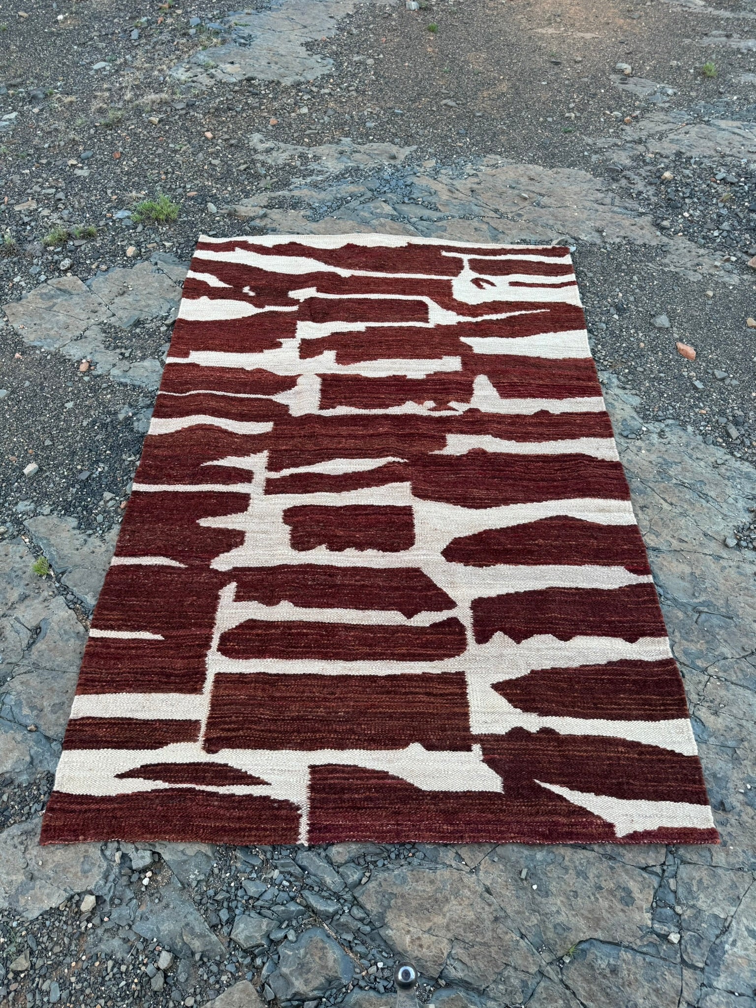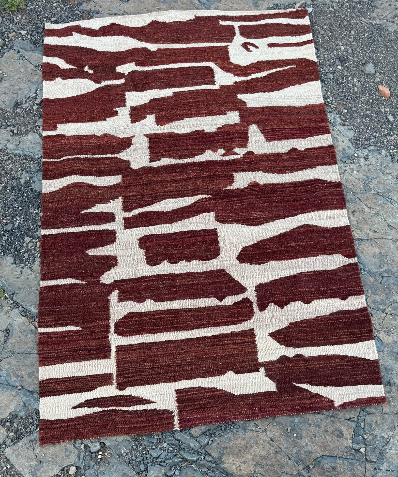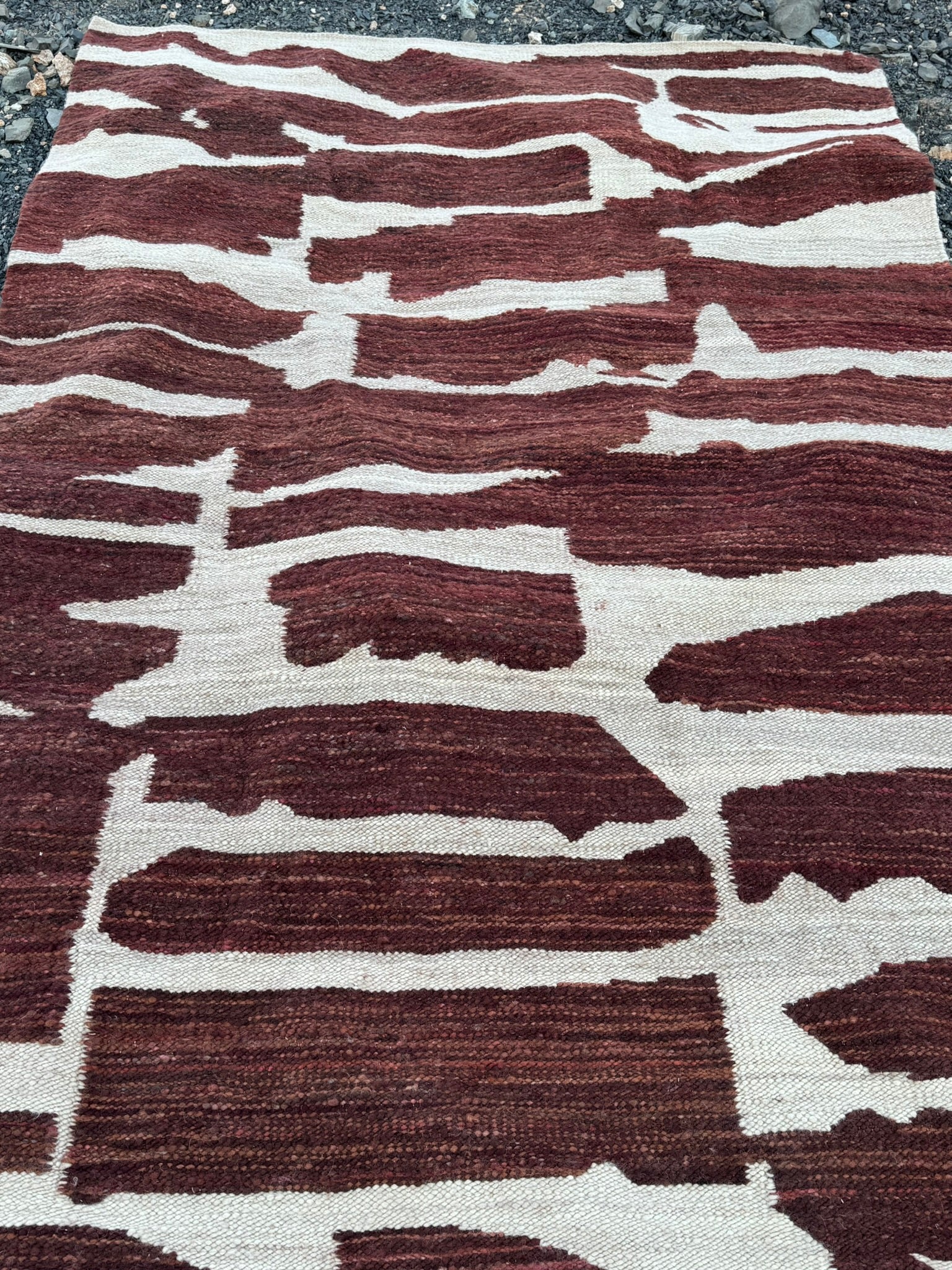 Add a touch of rustic charm to your space with this beautifully handwoven flatweave rug. Crafted by skilled artisans, it features an abstract pattern of irregular linear forms that flow across the surface, creating a textured and contemporary look. The organic design brings a natural rhythm to any room, perfectly balancing modern artistry with handcrafted warmth.